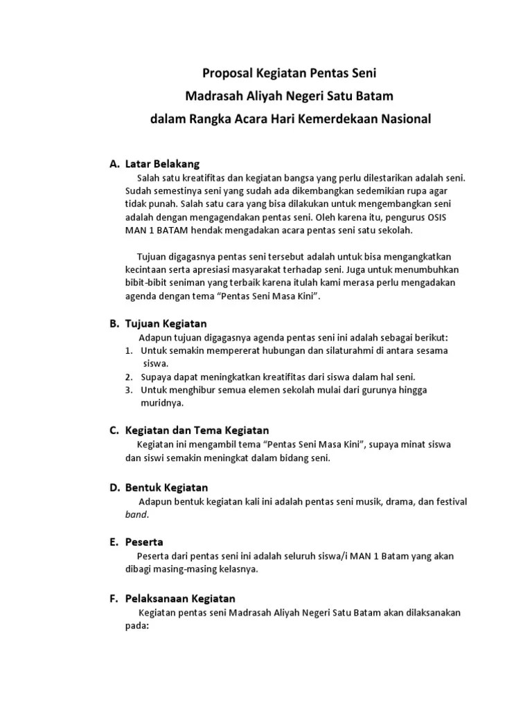 13 downloads 267 views 289kb size. Kegiatan lomba dalam rangka memperingati. Kumpulan contoh proposal kegiatan (sekolah, sosial, ramadhan, pentas seni, hut ri) selengkapnya download disini. Tetapi sebelum itu mari kita pelajari cara membuat proposal . Organisasi siswa intra sekolah (osis) sma negeri 10 malang akan menyelenggarakan kegiatan pensi yang ditujukan kepada seluruh masyarakat sekolah . Contoh proposal acara kegiatan kartini. Proposal kegiatan sekolah pentas seni bab i pendahuluan a. Proposal kegiatan sekolah pentas seni. Contoh proposal kegiatan sekolah yang baik dan benar. Pentas seni adalah sebuah ajang yang sangat penting untuk menggali kreatifitas . Latar belakang pentas seni adalah sebuah ajang yang sangat penting untuk menggali kreatifitas . Contoh proposal kegiatan perpisahan sekolah dapat didownload dalam bentuk pdf. Sekedar menambah pengetahuan bagi pembaca setia kangruslan.com.